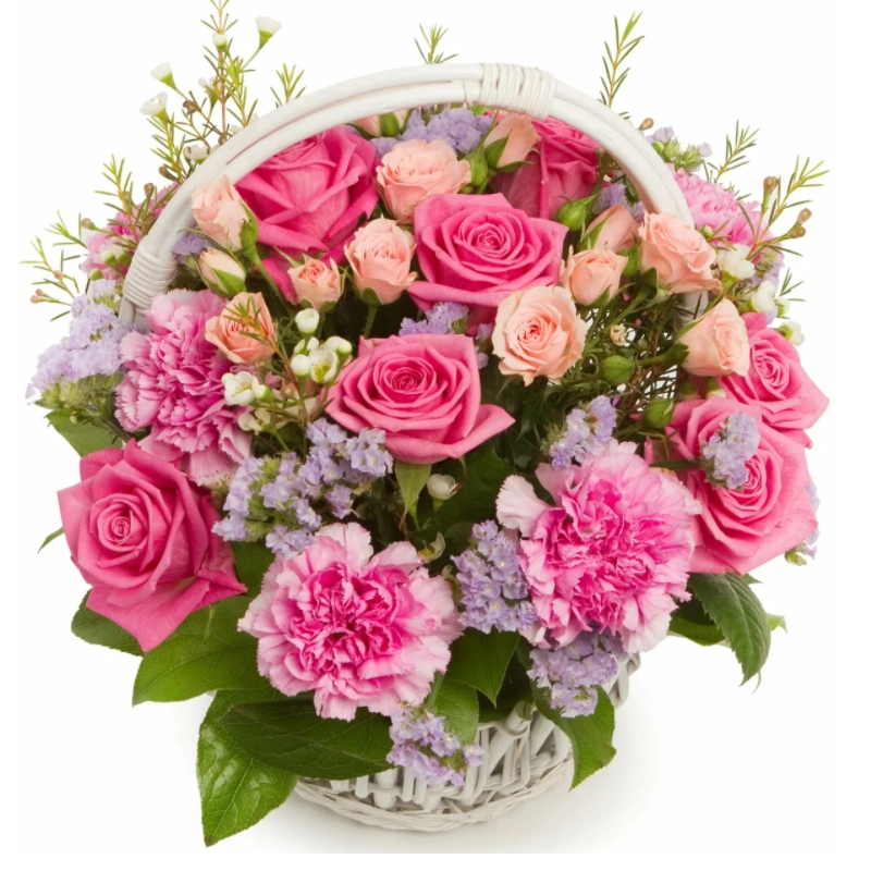 6 гвоздик, 3 ветки кустовой розы, 9 розовых роз, 6 статица, салал, корзина, оазис.