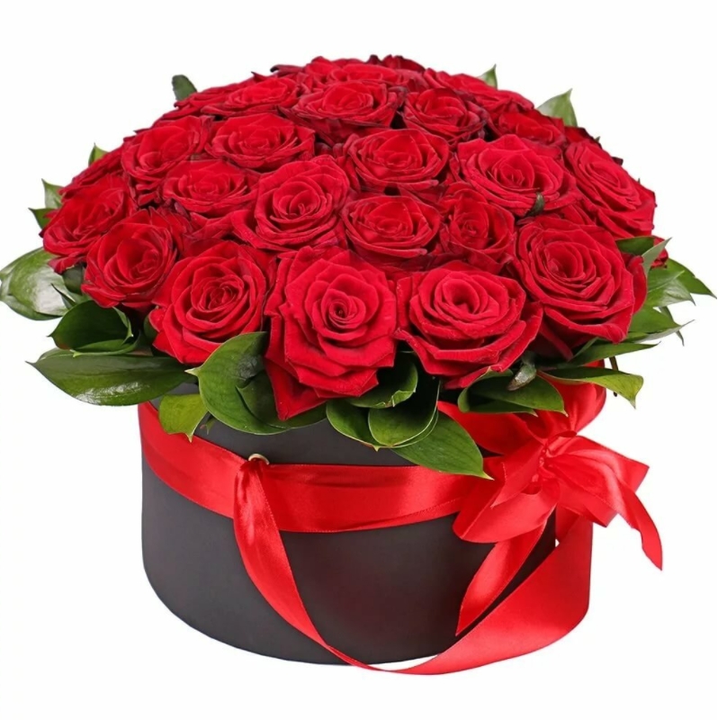 Букет состоит из 35 красных роз, салал, коробка, атласная лента.